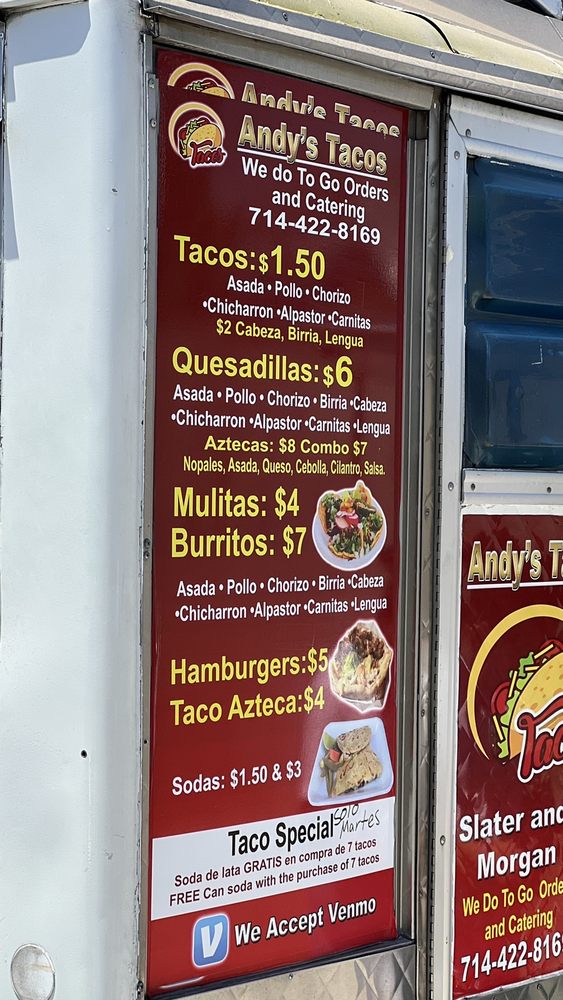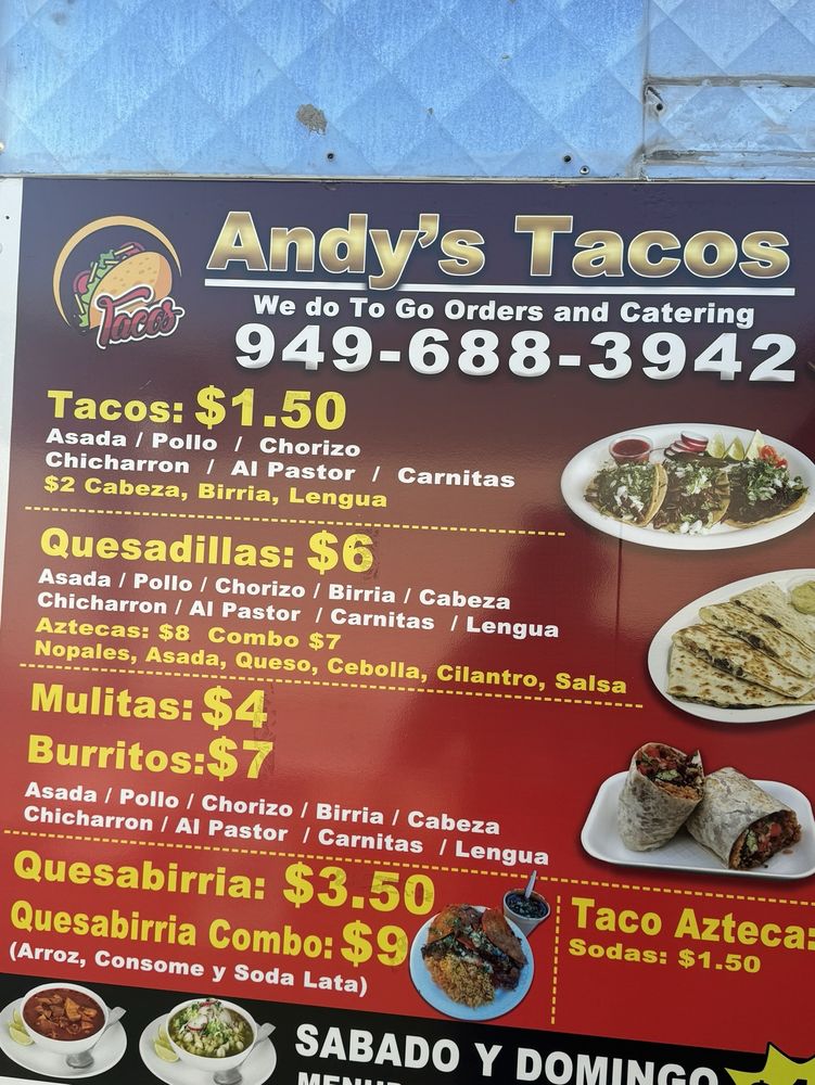 Andy's Tacos in Huntington Beach, CA, is a must-visit for taco enthusiasts. This women-owned food truck offers a variety of delicious tacos, including carne asada, adobado, carnitas, and birria. Customers rave about the affordable prices, especially during happy hour when tacos are just $1.00 each. The friendly owners create a welcoming atmosphere, with clean surroundings and accommodating seating. The menu also features burritos, quesadillas, and assorted drinks. Reviewers highlight the exceptional flavors and the Al Pastor burrito as a standout item. If you're in the area and craving authentic Mexican cuisine, Andy's Tacos is the place to be.